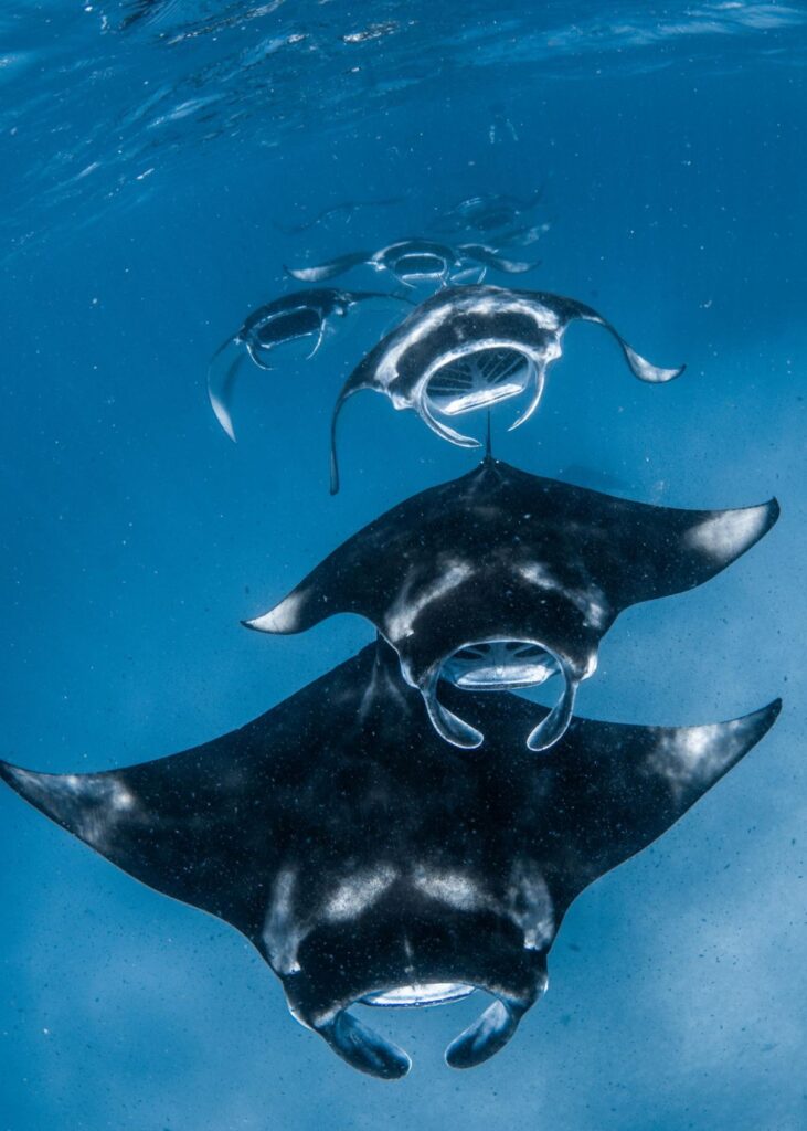 La experiencia continúa en Hanifaru Bay, un santuario natural donde, en temporada, se concentran grandes cantidades de plancton atrayendo a cientos de mantas y tiburones ballena, creando un espectáculo único en el mundo.